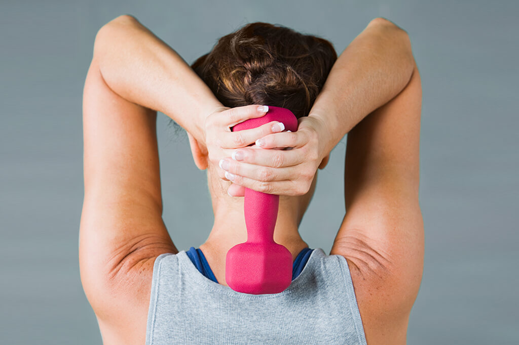 - Bring your arms over your head and bend the elbows at a 90 degree angle, so the dumbbell is now behind your head.