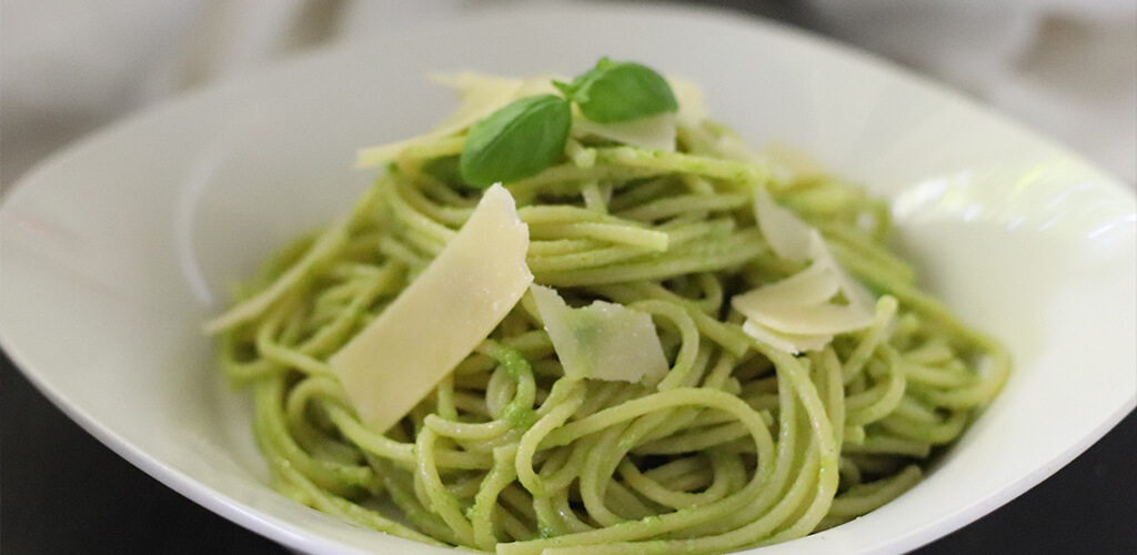 - Pour the pesto sauce over the still warm pasta and toss until all the noodles are well coated.