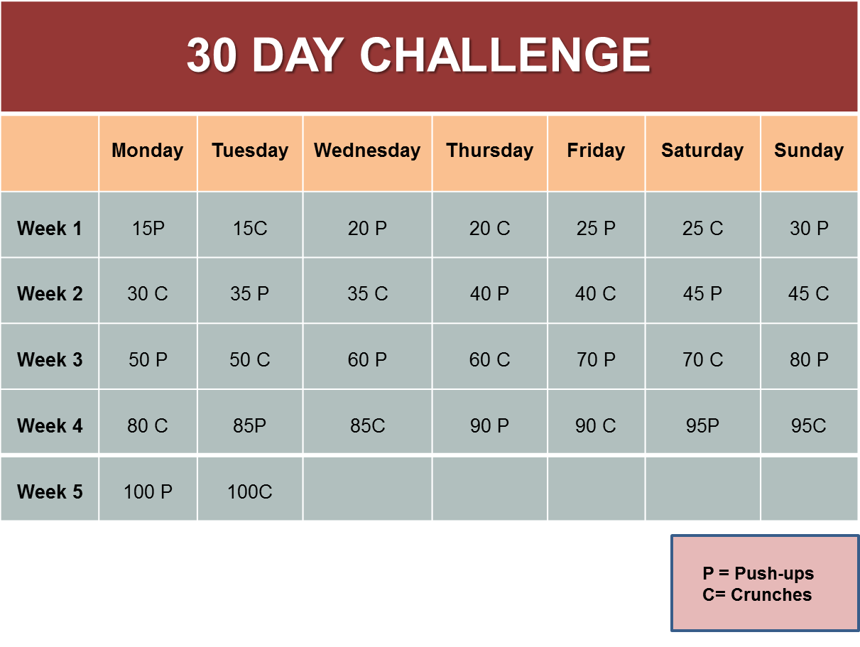 Here's a simple 30-day push-up and crunch challenge. The goal is to do the required number of exercises throughout the day, breaking them up into whatever number of sets you wish.