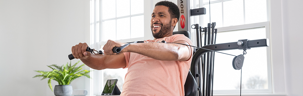 Man riding a bowflex bike in his home with other workout equipment in the background