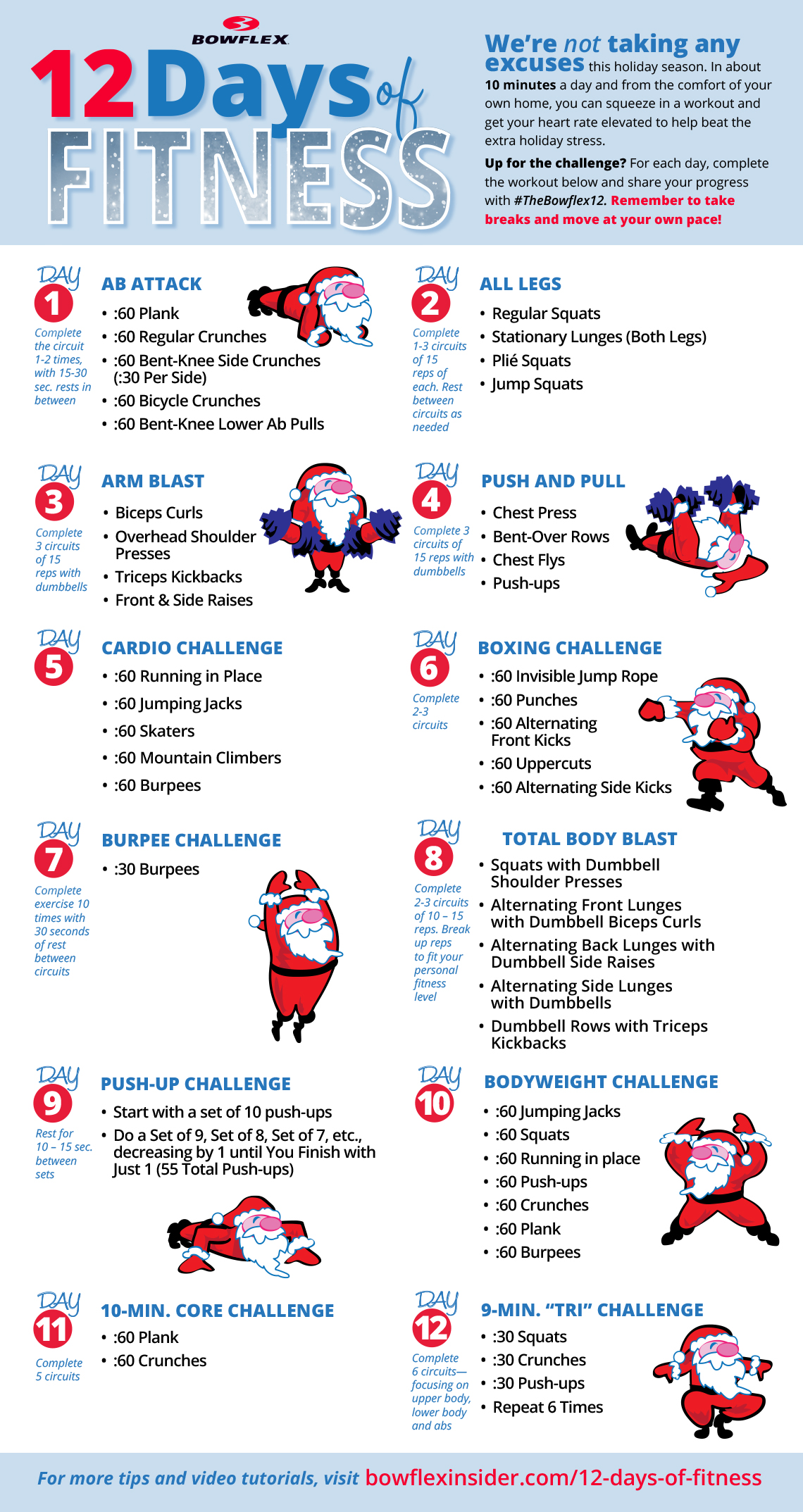 Thanks to the 12 Days of Fitness Challenge, busy schedules are no longer an excuse for skipping your workout routine this holiday season! Developed by BowFlex Fitness Advisor, Tom Holland, the plan features 12 days of quick workouts to help beat the holiday stressors.